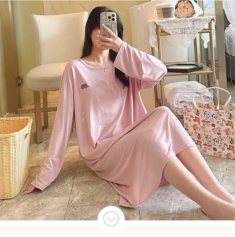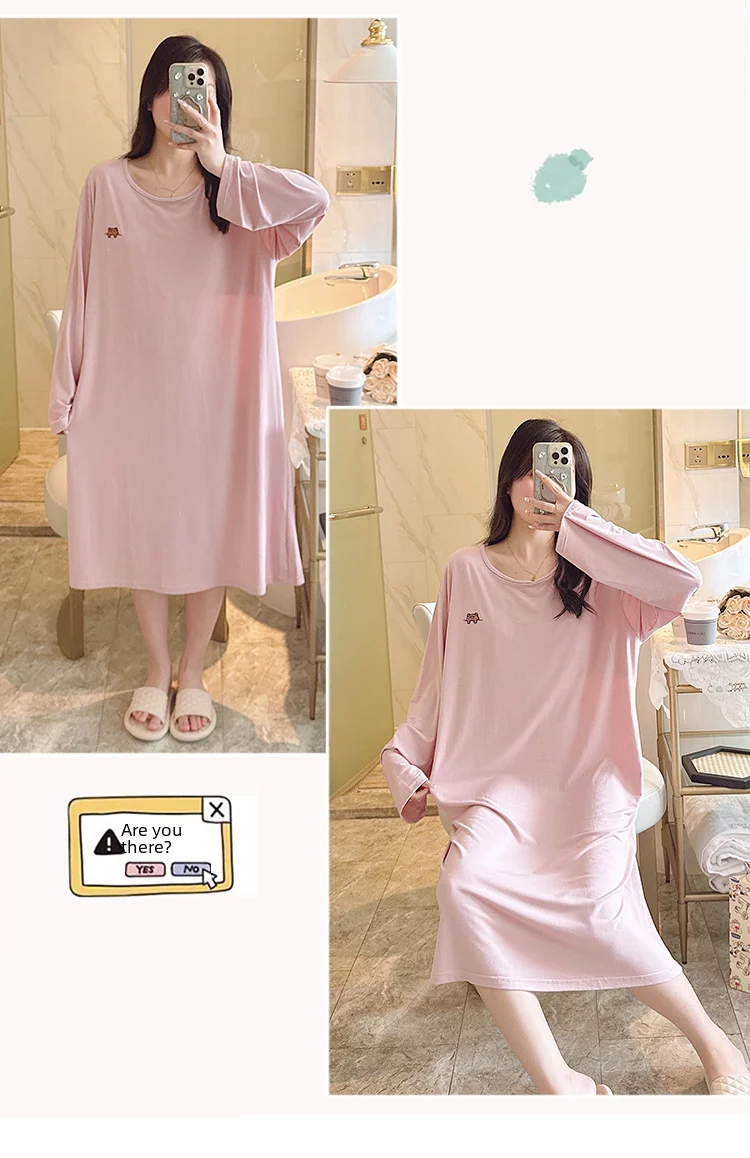 Spring Women's Long Sleeve Round Neck Nightgown Chest Pad Modal Fabric Sleeveless Sleepshirt Suitable For Homewear