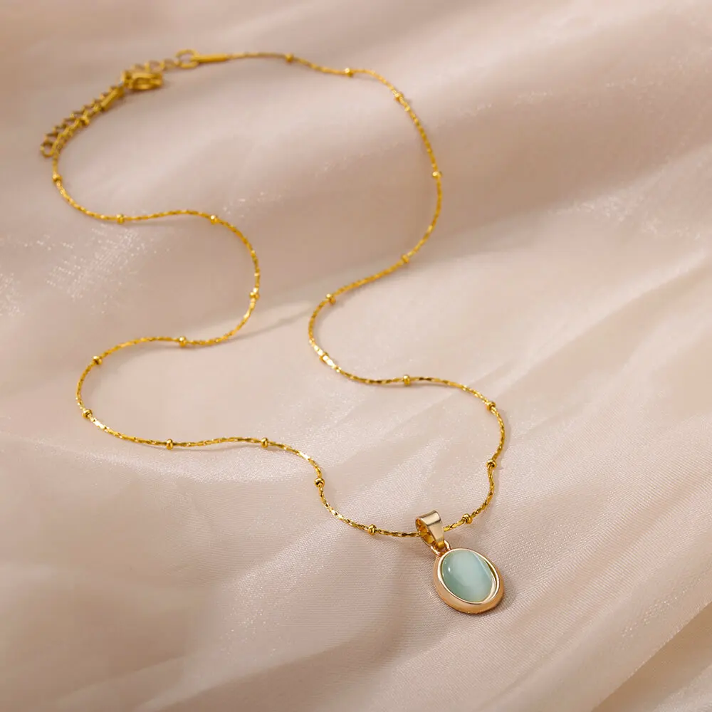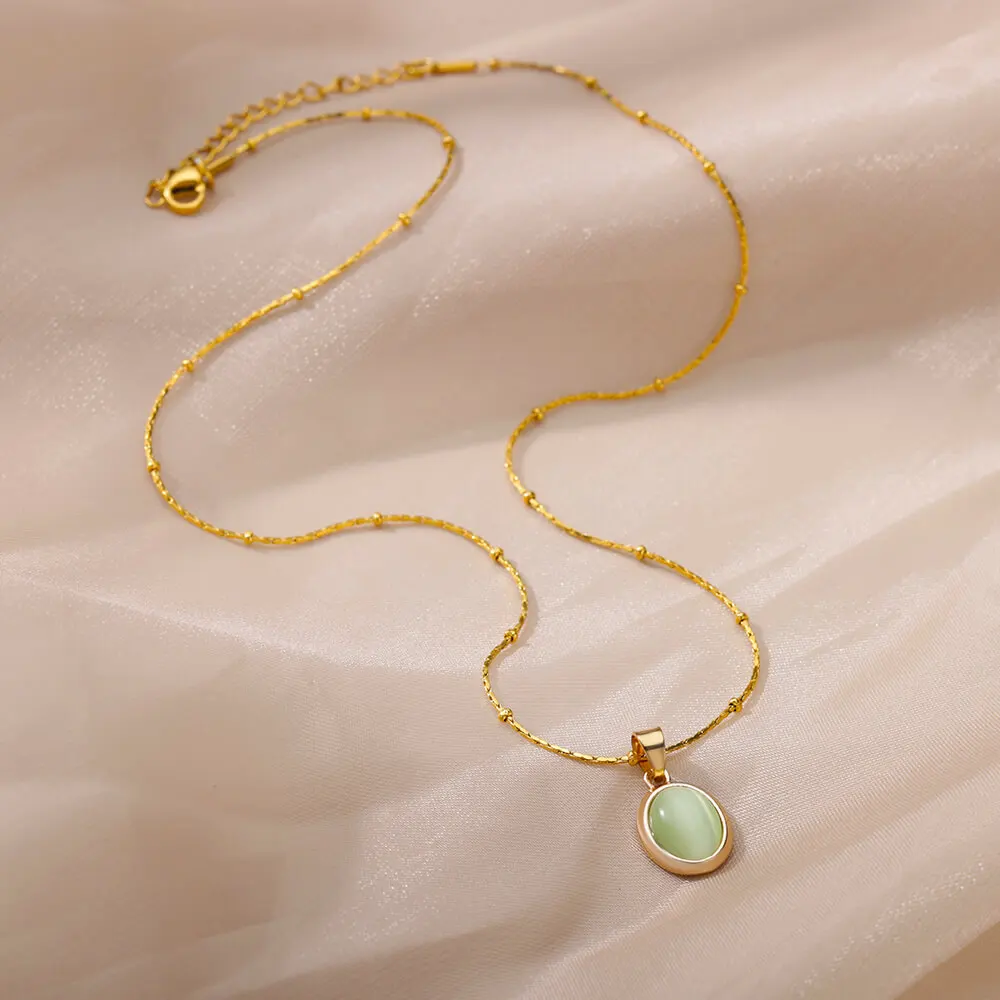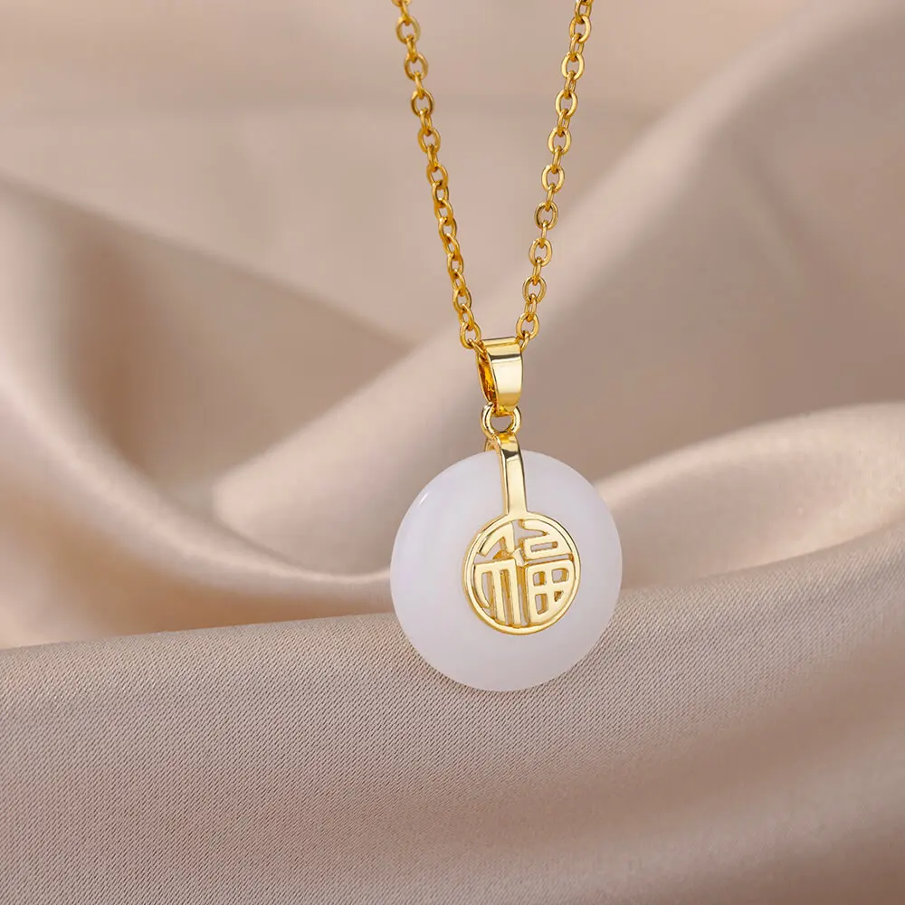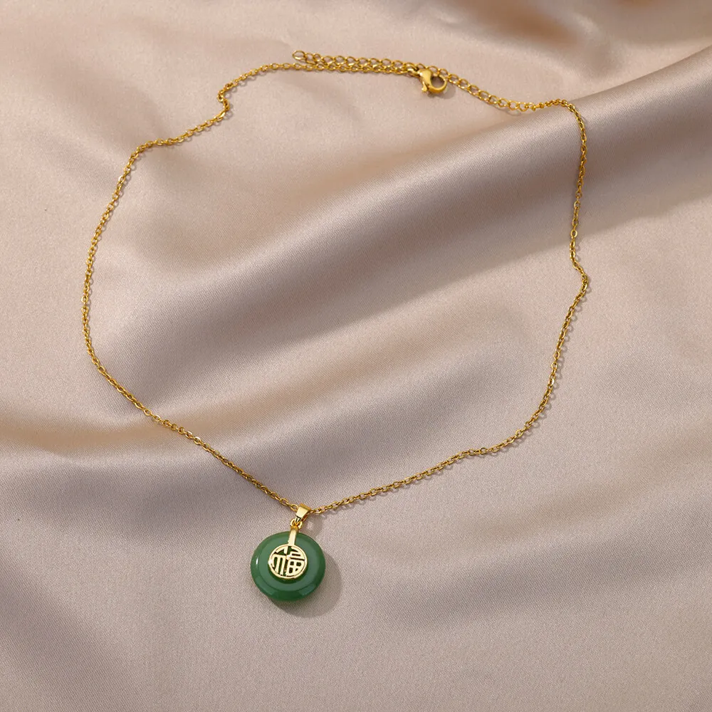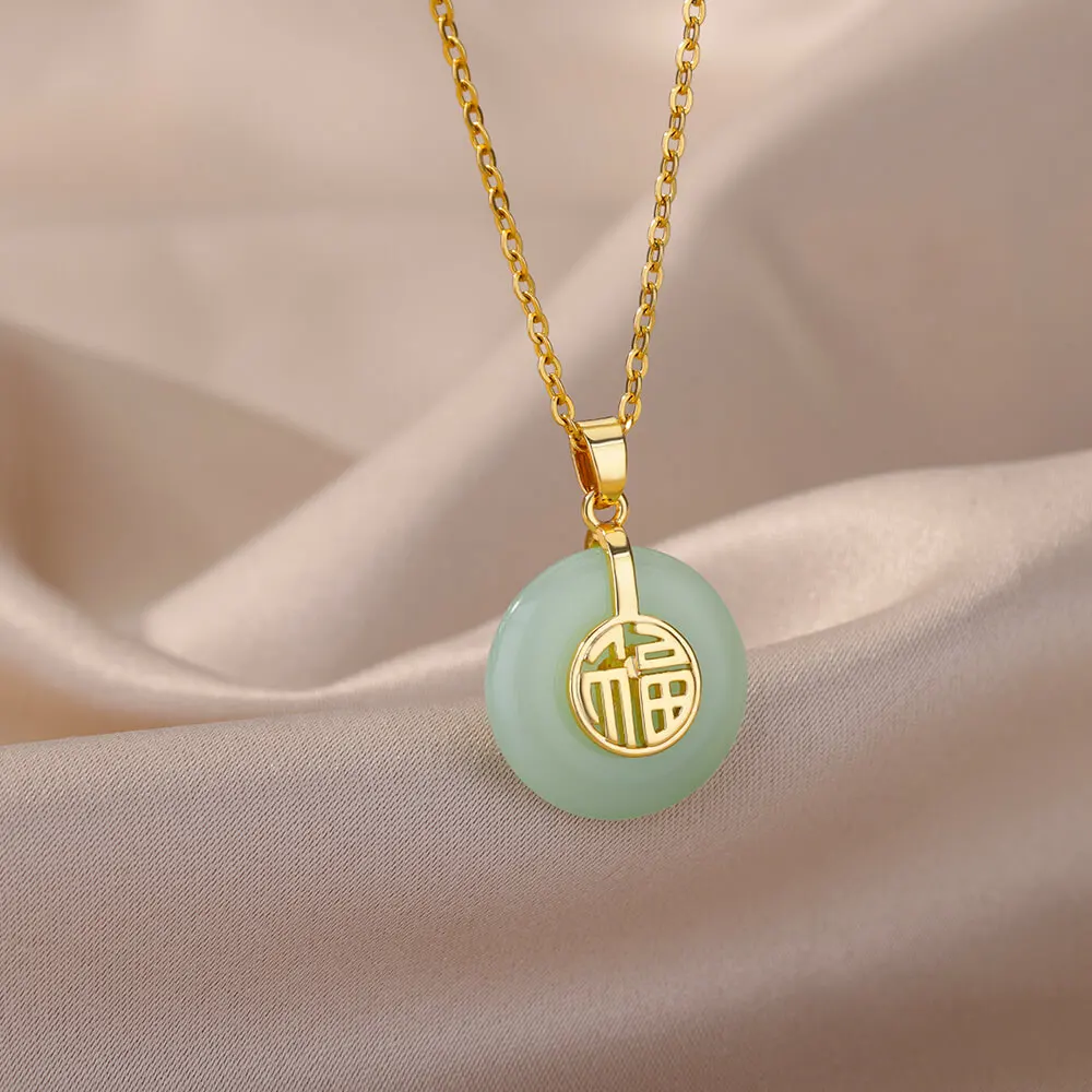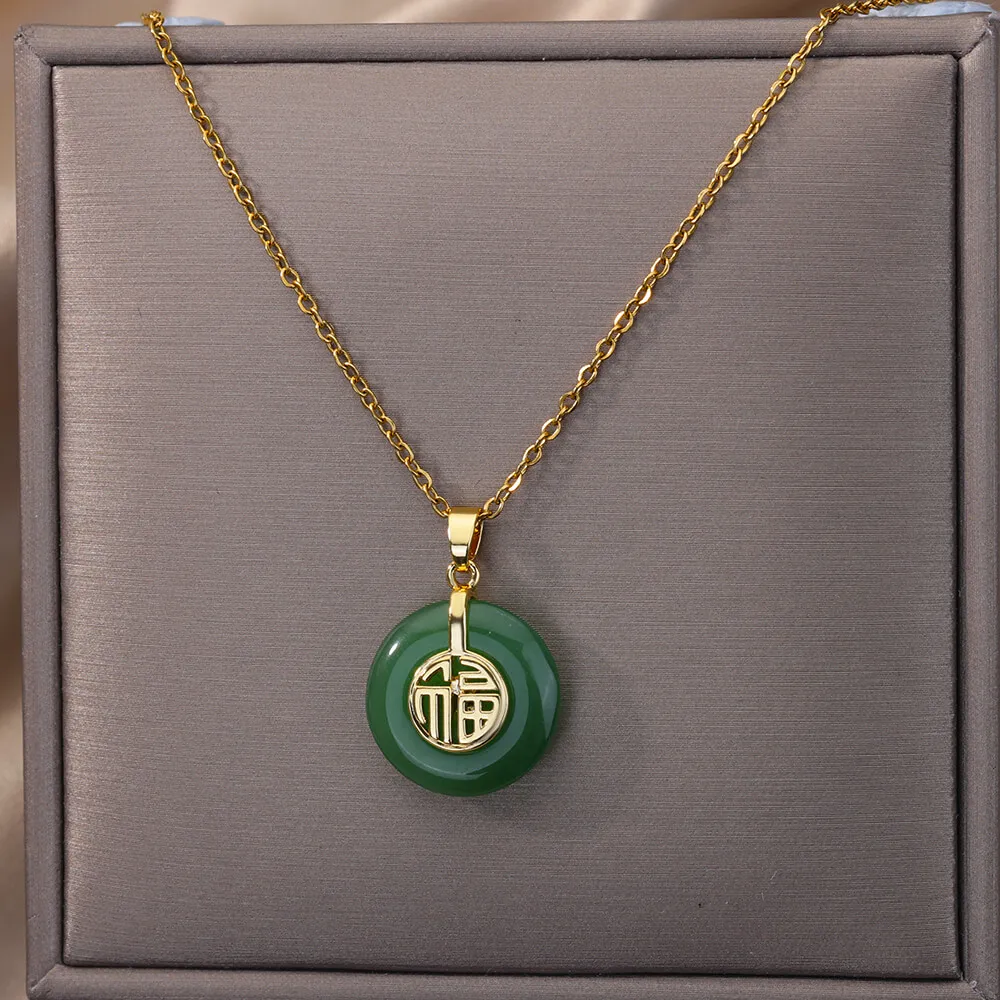 Vintage Natural Stone Necklace For Women Stainless Steel Round Good Luck Fu Choker Necklaces Collar Chain Jewelry Gift