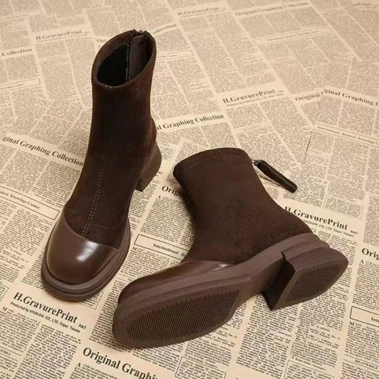 2025 Autumn New Women's Ankle Boots - Retro Panel Round Toe Side Zipper Chunky Heel Fashion Short Boots for Women
